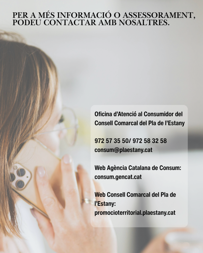 • Si ho consideres, també pots demanar assessorament a una associació de consumidors (organitzacions privades sense ànim de lucre que requereixen el pagament d’una quota de soci).