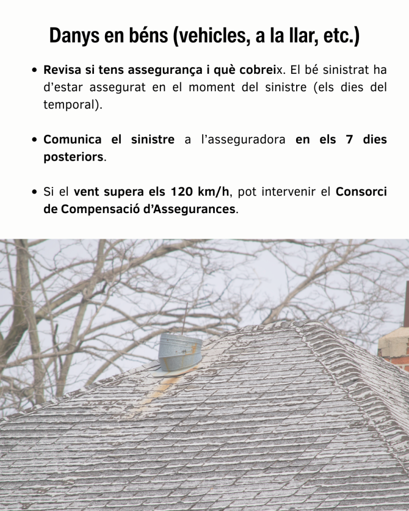 • Comprova quines assegurances tens contractades i si cobreixen els danys. Només es podrà aconseguir una indemnització si el bé sinistrat estava assegurat en el moment del sinistre (els dies del temporal).